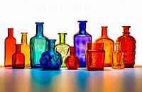 Flessen in diverse vormen en kleuren in dit digitale werk. De kleuren zijn fris en helder en bieden een vrolijke aanblik. Dit werk is tot stand gekomen met behulp van een zogenaamd Text to Image programma met Ai (kunstmatige intelligentie) en combineert traditionele kunst met de modernste technieken.