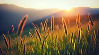 De foto toont een intieme macro-opname van een wilde grasspriet in de bergen bij zonsondergang en legt een vluchtig moment van stilte en warmte vast. Een enkele grasspriet staat op de voorgrond, de fijne haarstructuren en kleine dauwdruppels zijn duidelijk zichtbaar, hoewel de kleine scherptediepte de omgeving verandert in zacht bokeh.…
