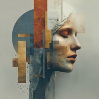 Een indrukwekkende symbiose van klassieke portretschilderkunst en hedendaagse digitale kunst wordt gepresenteerd in dit buitengewone werk. Het zijaanzicht van een vrouw met een hoofddoek wordt onderbroken door abstracte, geometrische vormen die lijken op puzzelstukjes van het geheugen.