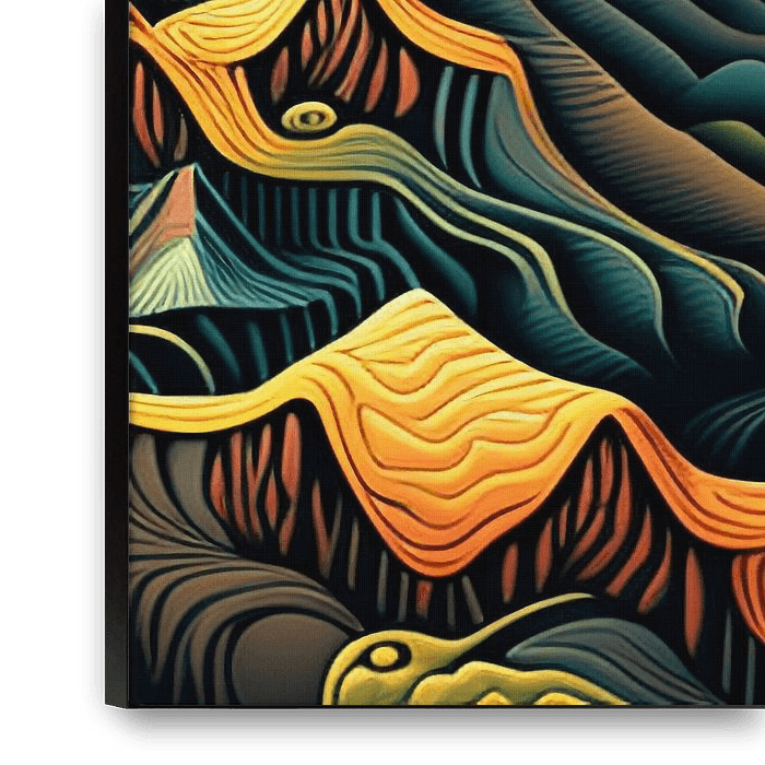 Dit kunstwerk verbeeldt een abstract, golvend berglandschap met levendige kleuren. De scène bestaat uit vloeiende bergkammen en valleien gekleurd in levendige tinten oranje, geel en groen, contrasterend met schaduwrijk blauw. De bergen rijzen dramatisch op, met vloeiende lijnen en contouren die beweging oproepen en een surrealistische,…