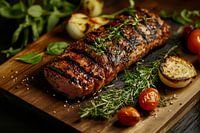 Sappig, gegrild vlees op een rustieke houten plank, omringd door verse kruiden en kleurrijke groenten - een lust voor het oog! De intense kleuren en het smakelijke arrangement brengen een levendige flair in elke keuken. Ideaal om het plezier van koken en genieten te vieren en om gasten te verwelkomen.
