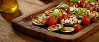 Roosterende smaken en frisse kleuren komen samen op een rustiek houten bord dat heerlijke gegrilde courgettes en sappige tomaten vol leven presenteert. Een vleugje basilicum en feta maken het plaatje harmonieus af. Ideaal voor in de keuken, het voegt een uitnodigende, gastronomische flair toe aan elke kamer.