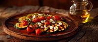Een rustiek meesterwerk dat de smaken van het land viert! Verse, sappige tomaten en malse courgettes dansen op een houten plank, afgewerkt met aromatische kaas en een drupje olie. Dit heerlijke arrangement zal een echte blikvanger zijn in de keuken of eethoek en stimuleert de anticipatie van gedeelde momenten van genot.