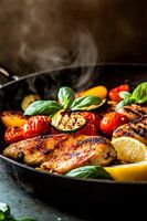 Sappige kipfilet ontmoet kleurrijke groentetoverij - de verleidelijke kleuren nodigen je uit om te smullen. Stoom stijgt prikkelend op, terwijl verse basilicum de smaakbeleving compleet maakt. Dit culinaire kunstwerk vindt zijn perfecte plaats in de keuken, waar het je uitnodigt om te inspireren en te genieten.