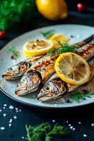 Een verleidelijk arrangement van sappige vis, vakkundig geplaatst op een elegant bord, combineert verse citroen en aromatische kruiden. De heldere kleuren en glanzende texturen nodigen uit tot smullen en brengen een vleugje mediterrane flair in je keuken. Perfect om culinaire passie te benadrukken en gasten te inspireren!
