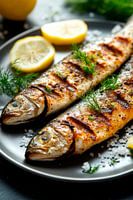 Een verleidelijk feestmaal trekt ieders aandacht: sappige gegrilde vis, vakkundig gegarneerd met verse kruiden en schijfjes citroen, nodigen uit tot smullen. De gouden huid glanst smakelijk en belooft heerlijke momenten van genot. Perfect voor een inspirerende keuken die kenners en hobbykoks aantrekt en de sfeer verrijkt met mediterrane flair.