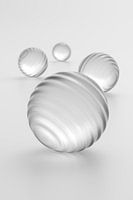Vier gerenderde glazen bollen met groeven en veel scherptediepte.
