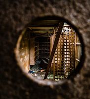 We kijken door een rond gat op de voorgrond naar een verlaten duivenboerderij. De verweerde houten muren en de stoffige vloer getuigen van de vergankelijkheid van deze ooit levendige plek. Een muur met ronde openingen, waardoor de duiven misschien ooit keken of vlogen, werpt een fascinerend schaduwspel op en versterkt de kalme, bijna melancholische sfeer. Afbrokkelende planken en verspreide resten vertellen over een vroeger dagelijks leven dat plotseling tot stilstand kwam. Dit beeld wekt nieuwsgierigheid op naar de geschiedenis van de fokker en het leven van de duiven die hier ooit leefden.