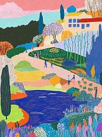 De kleuren zijn zacht en licht, zonder dat het te fel wordt. Toch straalt het schilderij een energie uit die je blij maakt. Het is alsof je een moment van puur geluk hebt gevangen en dat nu voor altijd kunt bewaren. Door de patronen krijgt het geheel een speels en modern gevoel, bijna alsof de natuur opnieuw is uitgevonden met een grafische twist.