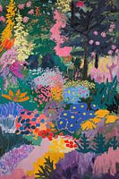 'Geheime Tuinoase' biedt een kijkje in een verborgen hoekje van de natuur, waar bloemen in een bonte verscheidenheid wedijveren om de aandacht. In deze luwe plek bloeien planten in roze, wit en blauw onder de beschutting van een statige boom, elk in hun eigen ritme van groei en bloei. De diepe groenen geven een gevoel van rust, terwijl de speelse kleuraccenten een glimlach oproepen. Dit stukje paradijs is een uitnodiging om de drukte te vergeten en te verdwalen in de wonderschone eenvoud van de natuur, direct vanuit je eigen woonkamer.