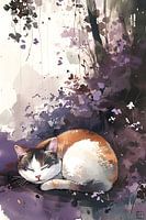 Een calico kat droomt tussen de levendige bloemen van een geheime tuin. Dit digitale schilderij legt de grillige en magische sfeer van een verborgen paradijs vast.