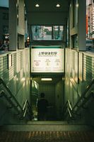 Deze foto vangt de gelaagde sfeer van een typisch metrostation in Tokio en toont de ingang van station Ueno-okachimachi. De scène speelt zich af in de vroege avond, wanneer het zachte licht de grijze tegels en metalen leuningen in een sfeervolle ambiance hult. In het midden stapt een persoon de trap op en verdwijnt in het gangenstelsel…