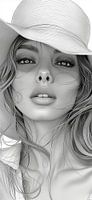 De gedetailleerde lijnen van de hoed en het haar versterken de elegantie van het kunstwerk, terwijl de minimalistische achtergrond de focus volledig op het gezicht van de vrouw legt. De combinatie van precisie en eenvoud maakt dit kunstwerk zowel visueel aantrekkelijk als emotioneel resonant.