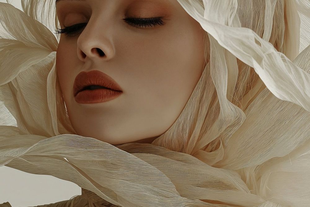 Een etherisch portret waarin delicate witte zijde als een dromerige wolk rond het onderwerp danst. De zachte belichting en subtiele sepia tinten creëren een tijdloze sfeer, terwijl de sierlijke vouw van de stof een gevoel van beweging en gratie vastlegt. De verfijnde make-up en gesloten ogen voegen een element van serene introspectie toe aan dit kunstzinnige beeld.