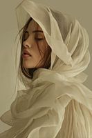 Een portret waarin transparante voile in zachte, roomwitte tinten als een delicate cocon rond het onderwerp draait. De compositie ademt een tijdloze elegantie uit, waarbij de subtiele plooien in de stof een etherische dans vormen tegen een neutrale achtergrond. Het spel van licht en schaduw door de doorschijnende lagen stof creëert een dromerige, bijna schilderachtige sfeer.