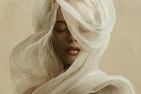 Een portret in zachte, warme tinten waar transparante witte sluiers als een delicate omhulling fungeren. De subtiele lichtval en de etherische kwaliteit van de doorschijnende stof creëren een dromerige, bijna mystieke sfeer. Het spel tussen licht en schaduw, gecombineerd met de zijdeachtige textuur van de stof, resulteert in een…