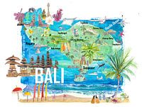 Geïllustreerde eilandkaart van Bali met toeristische hoogtepunten van Indonesië