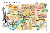 Geïllustreerde kaart van Münster-Westfalen met straten en toeristische hoogtepunten