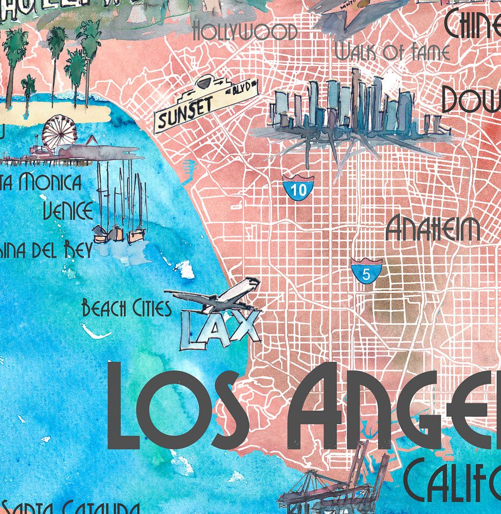 Geïllustreerde reiskaart van Los Angeles Californië met hoofdwegen, bezienswaardigheden en hoogtepunten