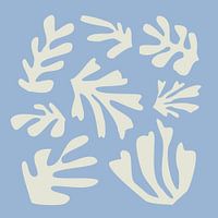 Geïnspireerd door Henri Matisse, wil ik u een prachtig natuurblad, koraal en zeewier schilderij voorstellen met ivoorkleurige bladvormen op een lichtblauwe achtergrond.