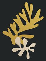 Geïnspireerd door Henri Matisse, wil ik graag een prachtige natuur blad cut-out collage presenteren met gouden, natuurlijke en beige bladvormen op een zwarte achtergrond.