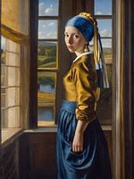 Het meisje met de parel staat voor het raam en kijkt uit over het prachtige platteland. De serene blik in haar ogen en de parel oorbel voegen een vleugje mysterie en elegantie toe aan het tafereel. Het gebruik van licht en schaduw zorgt voor een realistische weergave, een moderne maar toch ook klassieke versie op het schilderij van Johannes Vermeer.