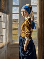 Het meisje met de parel staat voor het raam en kijkt uit over het prachtige platteland. De serene blik in haar ogen en de parel oorbel voegen een vleugje mysterie en elegantie toe aan het tafereel. Het gebruik van licht en schaduw zorgt voor een realistische weergave, een moderne maar toch ook klassieke versie op het schilderij van Johannes Vermeer.