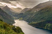 Eén van de grootste fjorden van Noorwegen het Geirangerfjord met in het dal het dorp Geiranger. De panorama van het fjord gemaakt in de herfst met de prachtige herfstkleuren.