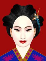 Geïnspireerd door de cultuur van Japan heb ik een geheel eigentijdse Geisha vervaardigd. Deze versie heeft niet de Japanse zon op de achtergrond. Let ook de versieringen in haar haar en de kimono.