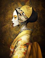 Een vrouw in traditionele Japanse kledij staat in profiel, versierd met een kimono en hoofddeksel met abstracte bloem patronen. Haar make-up is opvallend, met een witte huidskleur en opvallende gele oogschaduw die de rijke, bloemige achtergrond complementeert.