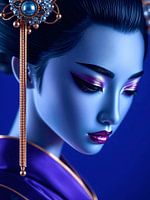 Dit betoverende digitale kunstwerk verbeeldt de tijdloze gratie van een traditionele Japanse geisha in levendige tinten saffier en paars.