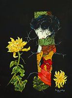 Geisha / Japan / Cultuur / Kimono / Chrysanten / Bloem / Plant / Kleur / Geel / Groen / Rood / Abstracte kunst / Oosterse kunst / Japanse kunst / Schilderkunst / Gouache verf / Vrouw / Portret