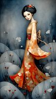 Het vrouwelijk portret toont een jonge vrouw gehuld in een kimono van warme goud- en oranjetinten. Haar aanwezigheid lijkt bijna etherisch: een verschijning tussen droom en werkelijkheid. De achtergrond – zacht vervloeiend in tinten blauw en grijs – vormt een poëtisch landschap van gestileerde bloemen. Hier versmelten realistische details met een impressionistische sfeer, waardoor de toeschouwer wordt uitgenodigd om te vertragen en te voelen.
