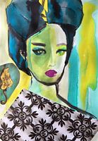 Moderne illustratie van een Geisha, gemaakt met waterverf waaraan stukjes gekleurd papier zijn toegevoegd. Het woord ‘Geisha’ heeft de letterlijke betekenis van ‘kunstpersoon’ of ‘kunstdoener’. Geisha is ook bekend onder de naam Geiko, wat ‘vrouw van kunst’ betekent. Vroeger hadden geisha’s extreem lang haar, om de bewerkelijke kapsels te kunnen creëren. Tegenwoordig wordt er veelal gebruik gemaakt van pruiken. Er zit veel symboliek verscholen achter de kimono, zo spelen de seizoenen bijvoorbeeld een belangrijke rol.