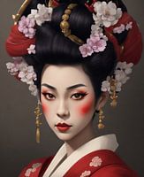 Geisha in mooi rustige pastelkleuren rood en roze dit is een mooi rustig portret.