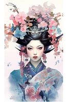 Een levend meesterwerk: een stralende geisha met kunstig gerangschikte bloemen in het haar betovert met een waar vuurwerk van kleuren.