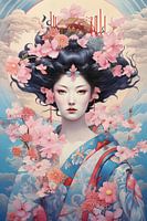 Een levend meesterwerk: een stralende geisha met kunstig gerangschikte bloemen in het haar betovert met een waar vuurwerk van kleuren.