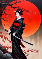 Een opvallend Japans kunstwerk met een geisha die een katana vasthoudt onder een gloeiende rode maan. De afbeelding combineert traditionele elementen, met de elegante kimono en evenwichtige houding van de geisha tegenover de woeste symboliek van de katana en de dramatische rode maan op de achtergrond, die een gevoel van mysterie en…
