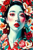 schilderachtige foto van fictieve sensuele oosterse Geisha vrouw met bloemen. Fijne details en heldere felle kleuren.