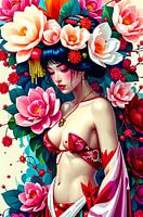 schilderachtige foto van fictieve sensuele oosterse Geisha vrouw met bloemen. Fijne details en heldere felle kleuren.