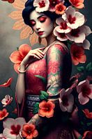 schilderachtige foto van fictieve sensuele oosterse Geisha vrouw met bloemen. Fijne details en heldere felle kleuren.