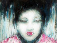 Portret van een jonge Japanse Geisha geschilderd met acrylverf en loopt in zachte stralen naar beneden wat een bijzonder effect geeft. Zij draagt een roze kimono en haar gezicht is wit geschminkt. Zij kijkt met half gesloten ogen bescheiden naar beneden waarschijnlijk in afwachting van wat er gaat gebeuren.