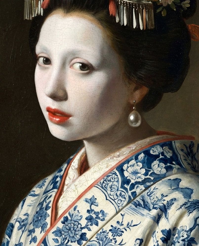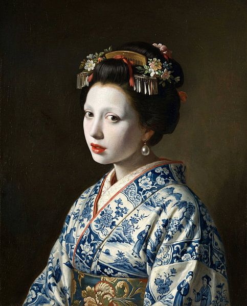 Het is het portret van een Japanse Geisha, ze draagt een kimono in Delfts Blauw design en in haar oor hangt een parel als oorhanger.