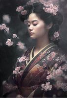 Portret van een jonge geisha in traditionele kimono met Japanse bloesem in een dromerige sfeer.