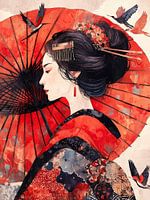 Illustratie in Japanse stijl van een vrouw in een gedetailleerde kimono, met een levendige rode paraplu en vogels die om haar heen zweven, tegen een zachte achtergrond