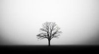 Een eenzame boom zonder bladeren staat centraal in een monochroom beeld tegen een mistige achtergrond, gegrond in een donker veld.