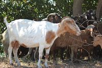 Geiten onder bomen op de dam bij het meer / stuwmeer van Kerkini in Griekenland