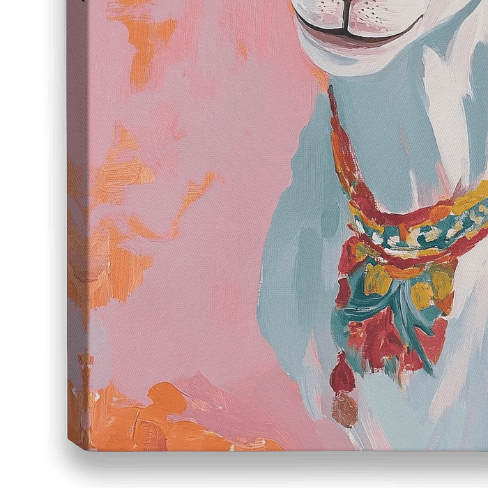 Geit Portret - Dit dierenschilderij toont een vrolijk portret van een geit met opvallend grote, gekrulde hoorns en een kleurrijke halsketting tegen een abstracte roze achtergrond.