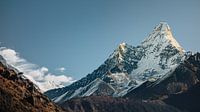 Een foto van een geit aan de linkerzijde en de prachtige berg Ama Dablam. Ama Dablam is een berg in de himalaya van Nepal.