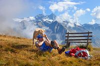 Een hongerige geit eet mee van een boterham welke een bergwandelaar aan het eten is voor de lunch tijdens een wandeling door het gebergte van de Grossglockner in Oostenrijk.